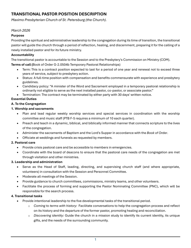 PC(USA) Minister of Word and Sacrament Maximo Presbyterian Church in St. Petersburg, FL, is seeking a compassionate, spiritually grounded Temporary Pastor (“Transitional Pastor”) to guide the congregation through a season of reflection, healing, and renewed purpose. This full-time role will provide dynamic worship leadership, thought-provoking preaching, and responsive pastoral care while partnering closely with the Session, staff, and Presbytery’s Commission on Ministry. The Transitional Pastor will lead the congregation through the five developmental tasks of transition—helping members understand their history, clarify identity, strengthen leadership, deepen connectional ties, and prepare for a newly installed pastor. Ideal candidates bring strong administrative skills, a collaborative spirit, and a heart for equipping lay leaders as the church discerns its future mission and ministry. Maximo Presbyterian Church, 3200 58th Av South, St. Petersburg, FL 33712